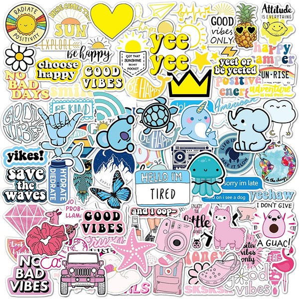 - ⭐️ 100 UNIQUE VSCO STICKERS multi-color ( pink,blue,yellow, multi-color) per pack. Each pack includes 100 cute VSCO stickers with high-definition printing, which are an essential element on the VSCO girl checklist. Their sizes range from 2 inch to 3 inch.