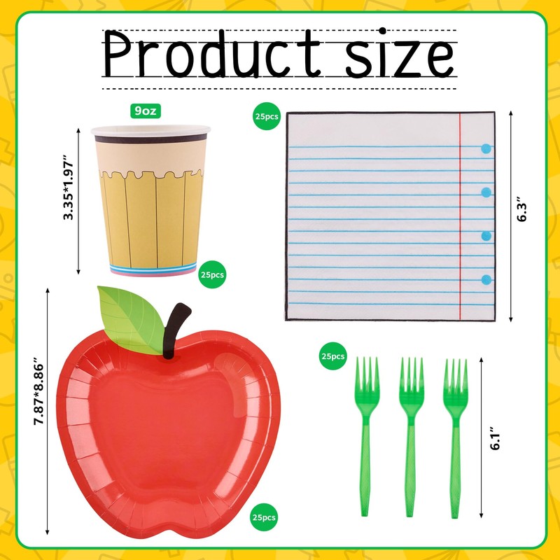 - Handy Dimensions: Perfect for back-to-school parties, this set includes 25pcs of 9-inch apple plates, 25pcs of 6.5-inch notebook napkins, 25pcs green forks, and 25pcs pencil-patterned cups (2.9-inch diameter, 3.4-inch height, 9 oz capacity). Practical and creative, it adds charm to your event while ensuring easy cleanup.