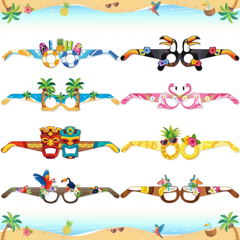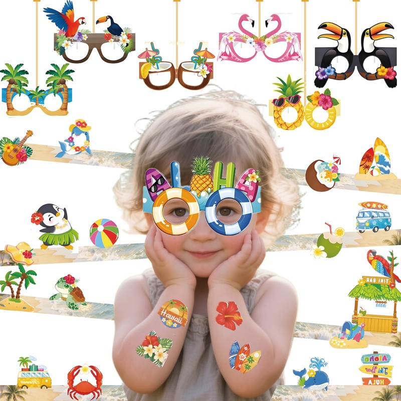 The 8 paper glasses (13.4*15.5*14.3cm) are lightweight (33g) and printed with bold tropical patterns, making them a hit for dress-up and group photos. Kids will love wearing them while showing off their matching tattoos, creating a festive atmosphere that captures the joy of summer.