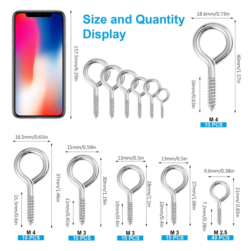 - ✔️ Package Contents - 100 pieces screw in eyes for wood are matched with 6 sizes are packaged in a plastic pox, portable and easy to store.