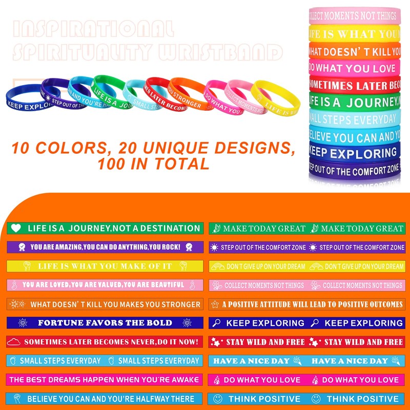 • Rico en estilos: recibirás 100 pulseras motivacionales en un paquete, incluyendo 20 tipos diferentes de estilos, cantidad suficiente y estilos para satisfacer tus necesidades de uso diario y reemplazo, puedes compartir con tus amigos al mismo tiempo