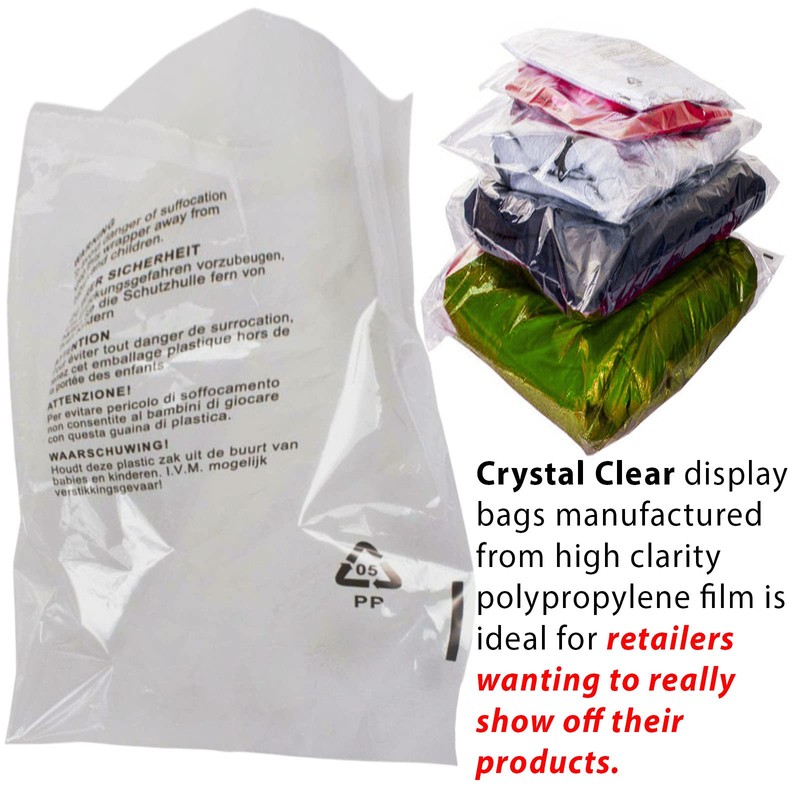 - Clear poly bags with suffocation warning labels printed in 5 languages. Suffocation warning is written in English, German, French, Italian & Dutch. The warning is printed on the back side and states "WARNING: To avoid danger of suffocation keep this wrapper away from babies and children”