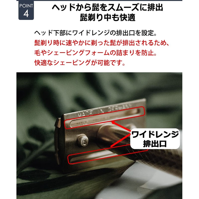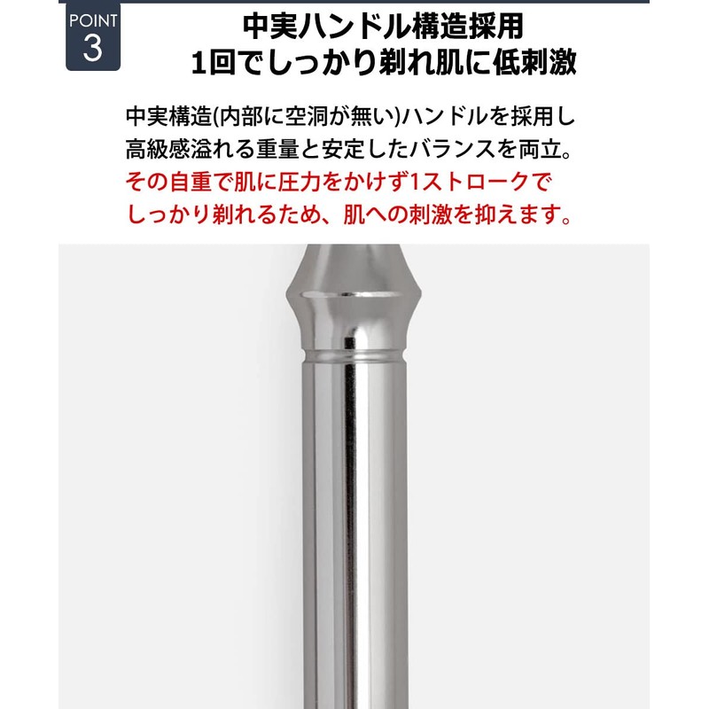- Uses a middle handle construction. Firmly shaved with 1 stroke and hypoallergenic to the skin: The neutral structure (no hollow inside) handle provides a sense of luxury weight and a stable balance. Its own weight allows you to shave firmly with one stroke without applying pressure to your skin, reducing irritation to the skin. Smooth whiskering from the bottom of the head and comfortable while shaving: Wide range outlet is set at the bottom of the head. Shaving quickly discharges shaved beard for comfortable shaving