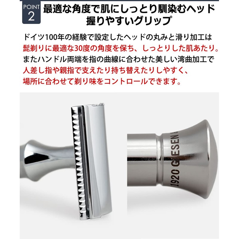 - Round head shaves at an optimal angle and fits moist to your skin: The head is rounded and slippery based on 100 years of experience by German craftsmen. It is easy to maintain a 30 degree angle that is perfect for shaving, so you can experience a moist and smooth skin. (Easy grip allows you to precisely adjust the shaving flavor) The ends of the handle are curved to fit the curves of your fingers and make it look beautiful. Easy to hold and change with your index finger or thumb and control your shave according to your location