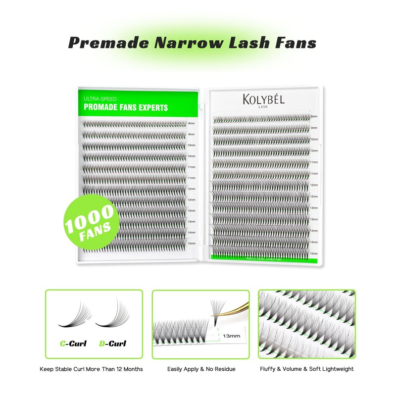 - COST EFFECTIVENESS:Kolybel pre made fans lash extensions 1000 fans/ box,8-15mm mixed Length lash tray. Premade fans eyelash extensions mixed lash tray are more affordable and durable. Meet your needs in length, curl and thickness,and help you save money and time on choosing eyelash extensions.