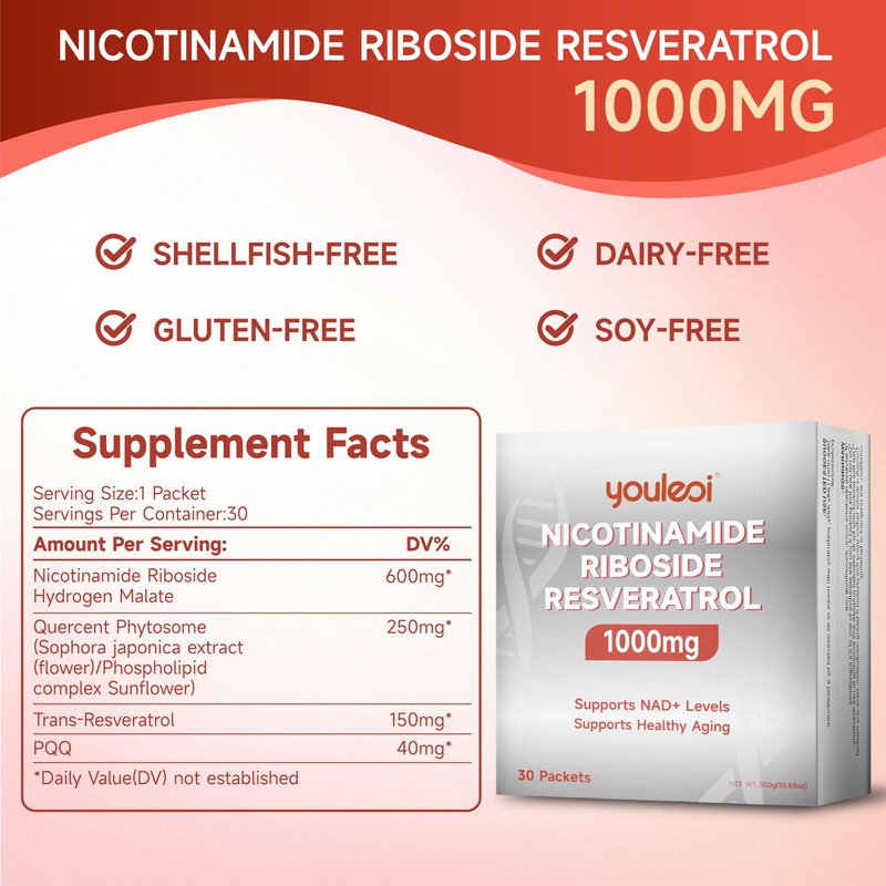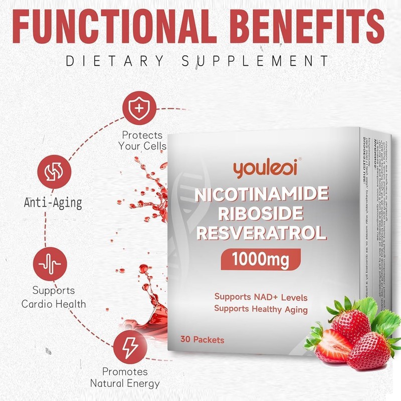 NAD+ Level Support: Each serving contains 1000mg of Nicotinamide Riboside along with Resveratrol, Quercetin, and PQQ. This powerful blend works together to restore NAD+ levels, enhance skin vitality, and protect against oxidative stress.