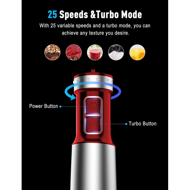- 【25 Adjustable Speeds】 Our hand blender offers 25 adjustable speeds, making it versatile for all your kitchen needs. From mixing batters and blending smoothies to pureeing baby food, this blender ensures perfect results every time.