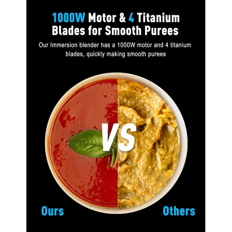 - 【1000W High-Power Motor】Our 2025 Immersion Blender, powered by a 1000W pure copper brushless motor, effortlessly crushes even the toughest ingredients. Designed for power and durability, it ensures smooth, consistent results with every use.