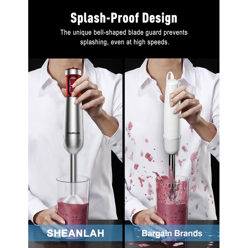 - 【Anti-Splash and Scratch-Resistant Design】Our immersion blender features a unique bell-shaped blade guard that prevents scplashing and protects your containers from scratches, keeping your kitchen clean and your cookware looking new.