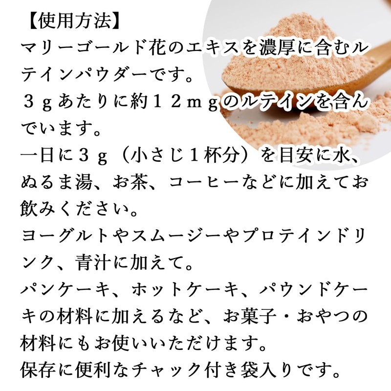 【 ルテイン について】 ルテイン はカロテノイド(ファイトケミカル)の一種で黄色の天然色素です。マリーゴールドの花や食べ物ではほうれん草、にんじん、かぼちゃなどの緑黄色野菜に含まれています。 同じカロテノイドのゼアキサンチンという成分と存在しており、人体では目の水晶体に元々存在しています。 昨今は ルテイン を含むサプリメントが複数の食品メーカーから登場し、男性、女性を問わず口コミもあって注目されています。 【商品について】 本品はマリーゴールド花弁のエキス(抽出物)を濃厚に含むサプリメント粉末(パウダー)です。 ルテイン 、ゼアキサンチンともに、体内に存在するものと同じ形であるフリー体です。 3gあたりに約12mgの ルテイン を含んでいます。 水溶性で水やお茶にもスムーズに溶けます。 ほんのりと甘く飲みやすい ルテイン パウダーをお試しください。 保存に便利なチャック付き袋入りです。 【使用方法】 一日に3g(小さじ1杯分)を目安に水、ぬるま湯、お茶、コーヒーなどに加えてお飲みください。 ヨーグルトやスムージーやプロテインドリンク、青汁を飲まれる方はそれらに加えるのもおすすめです。 そのほかパンケーキ、ホットケーキ、パウンドケーキの材料に加えるなど、お菓子・おやつの材料にもお使いいただけます。 高齢者の方向けの介護食、療養食、ソフト食の材料としておためしください。 犬ちゃん猫ちゃんなどペットにも。ドッグフード、キャットフードにも加えてお使いください。