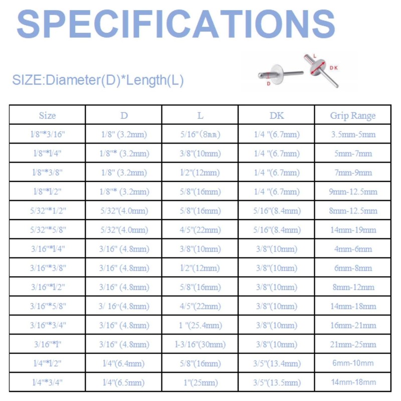 - Diameter: 1/8inch,Grip Range: 5/16-3/8inch