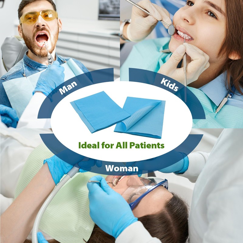 - SOFT AND DURABLE: Our dentist bibs feature a horizontal embossing pattern and are soft and absorbent. The lightweight elasticized fiber stretches to comfortably fit every patient and strong, tear-resistant plastic backing allows for increased clothing protection.