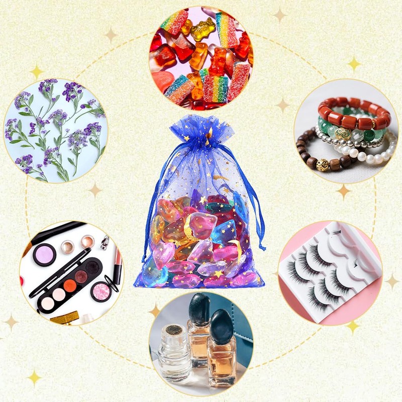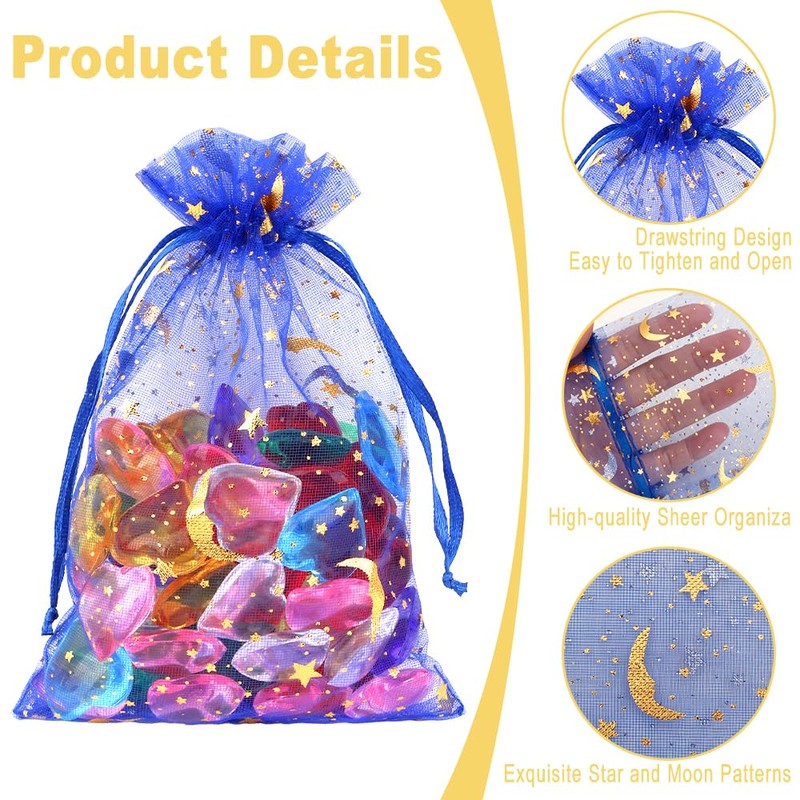 - Sufficient Quantity: You will receive 100 organza bags with shiny moon and star patterns printed on the surface. There are mixed-color and single-color options for you to choose from. The packaging is vacuum-packed to ensure that your bags arrive intact. The quantity is sufficient to meet your daily needs. You can use them to store various items such as jewelry and cosmetics or to decorate various parties