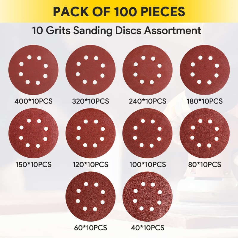 100Pcs Sanding Discs Pads, AUGOLA Hook and Loop 40 60 80 100 120 150 180 240 320 400 Mixed Grits 125mm Sandpaper Sheet for Random Orbital Sander, 8-Holes