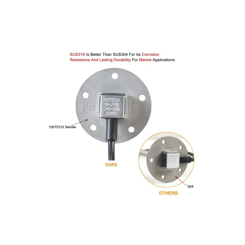- <b> Rugged Construction,Long Service Life</b>The Body of 100TECH Sender Are Made From <b> 316 Stainless Steel. </b> The Benefit of using 316 Stainless Steel Include Its Corrosion Resistance And Lasting Durability For Marine Applications. You May Pay A Little More Upfront, But In The Long Run, You'll Save Money Since You Won't Have To Replace Your Sender As Frequently. You Can't Tell The Difference By Simply Looking At It. However, 304 Rusts Faster As It Has Less Nickel And No Molybdenum.