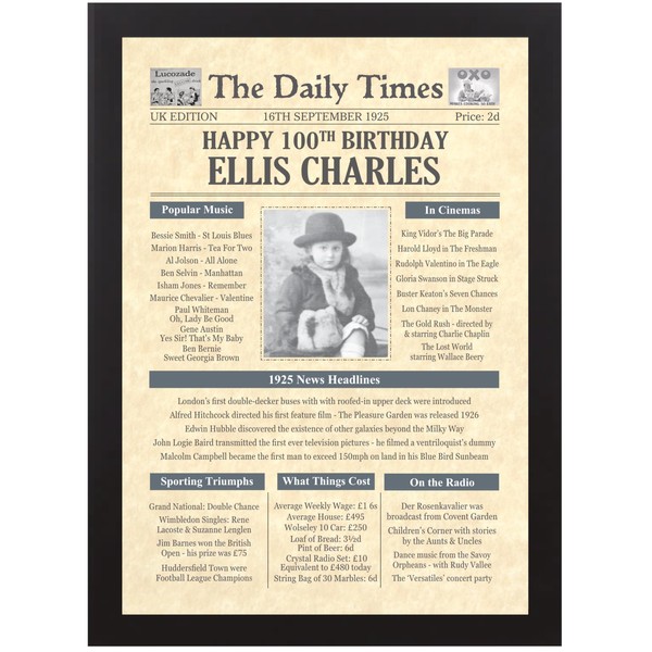 100th Birthday Gifts for Mum Dad Nan Grandad Born 1925 - Day You Were Born Newspaper Photo Gift