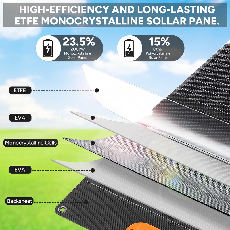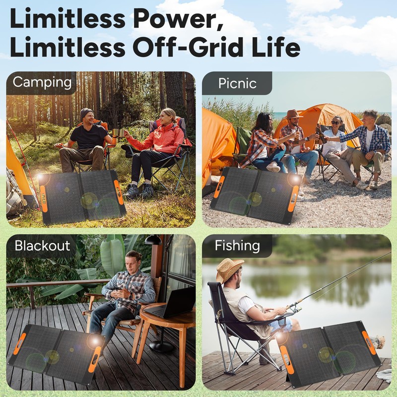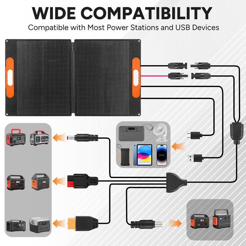 • Versatile Output and Wide Compatibility:100W foldable solar panel comes with a controller which is equipped with 3 versatile interfaces to meet all your charging needs .The solar interface can seamlessly connect to our complimentary 10ft 4-in-1 solar cable (XT60/ANDERSON/DC5521/DC7909), ensuring compatibility with the majority of outdoor power station available in the market;1*Black USB-A(5V/3A),1*orange USB-A(12V/1.5A)&1*Type-C(20V/3A)can charge USB devices like phones, tablets,laptops etc