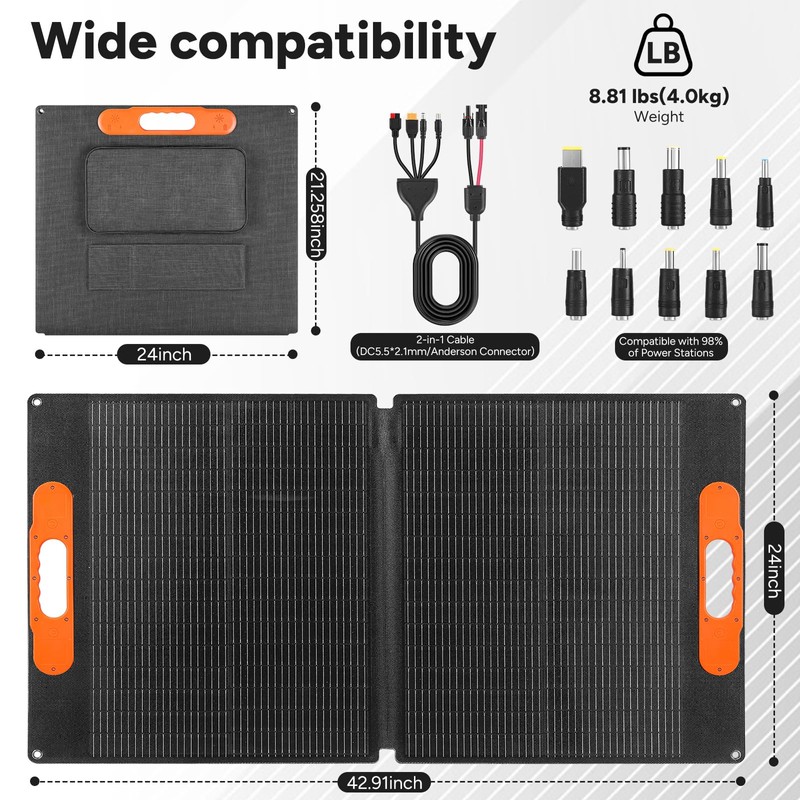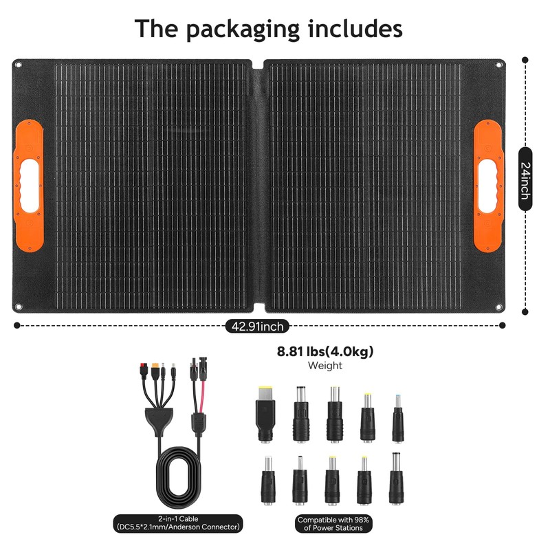 • The packaging includes:1*100W foldable solar panel,1*10ft 4-in-1 solar extension cable(solar to XT60/DC5521/DC7909/ANDERSON),1*user manual,10-in-1 DC connector.Includes USB QC3.0 fast charging