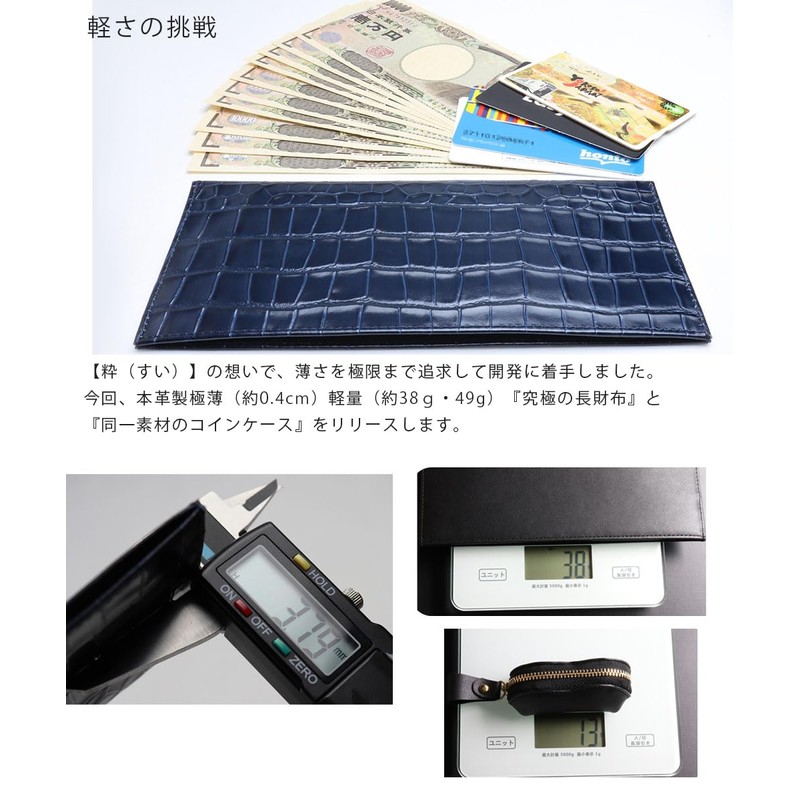 - (Basic Specifications) Size: Long wallet approx. 7.5 x 3.3 x 0.2 inches (190 x 83 x 4 mm), Coin case approx. 3.1 x 1.2 x 1.1 inches (80 x 30 x Weight: Long wallet: 1.5 oz (38 g); Coin case: 0.5 oz (13 g); Crocodile-style long wallet: 1.9 oz (49 g); Coin case: 0.6Material: Genuine cowhide leather