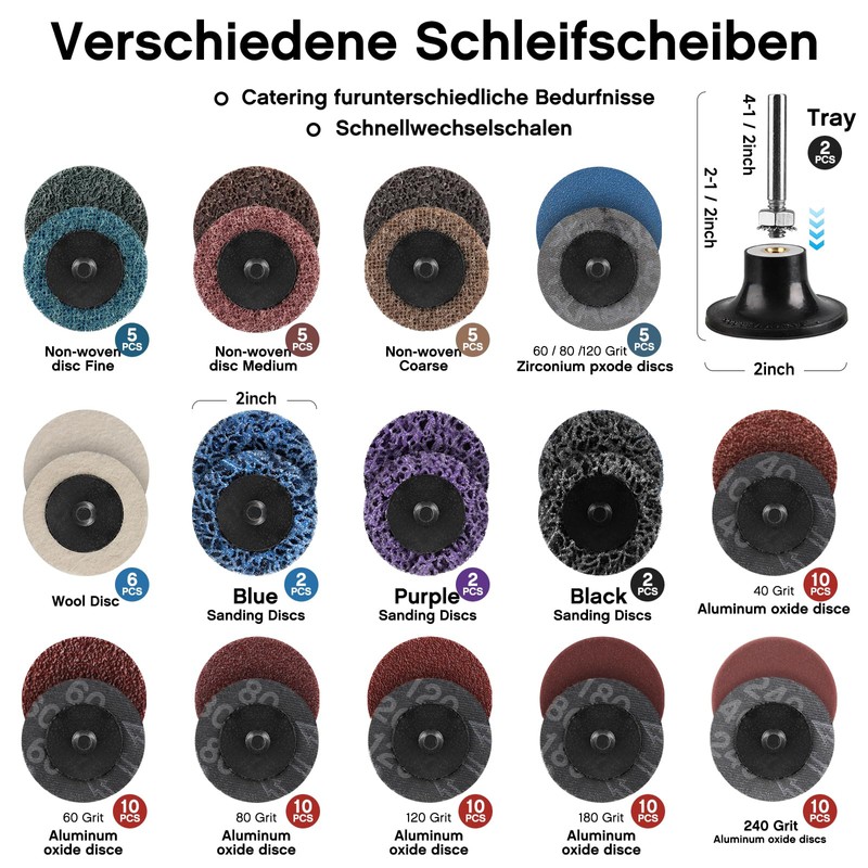 - Quick Change Sanding Discs Set:This 2 inch sanding discs set come with 104pcs alumina discs red (40/60/80/120/180/240 10pcs each), zirconium corundum discs blue (60/80/120 5pcs each), non-woven discs (blue/yellow/red 5pcs each), vajra purple discs 2pcs, blue discs 2pcs, black discs 2pcs, fleece wheel discs 6pcs, pallet with rod 2sets
