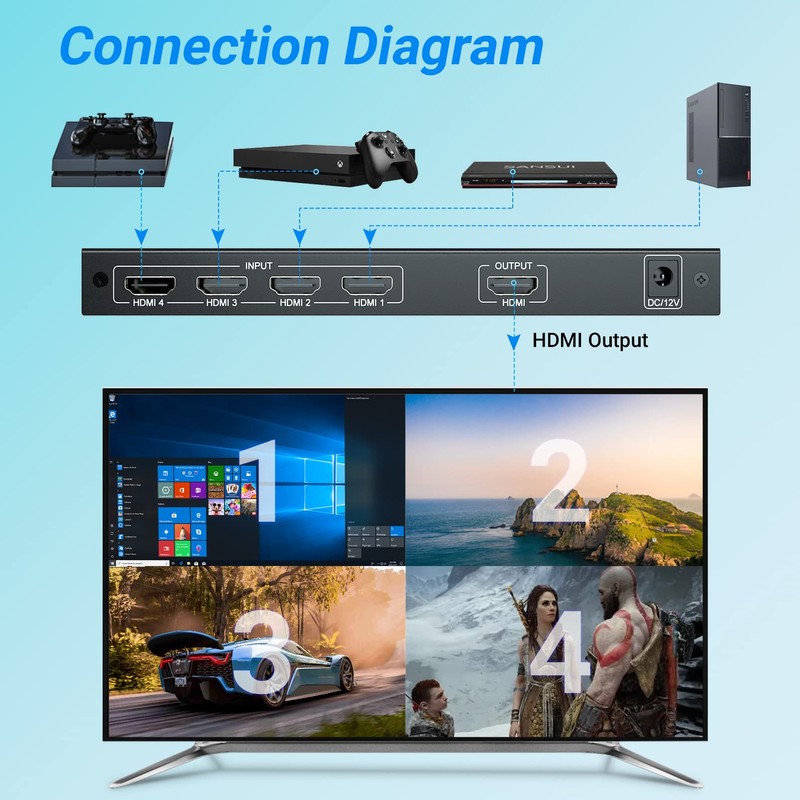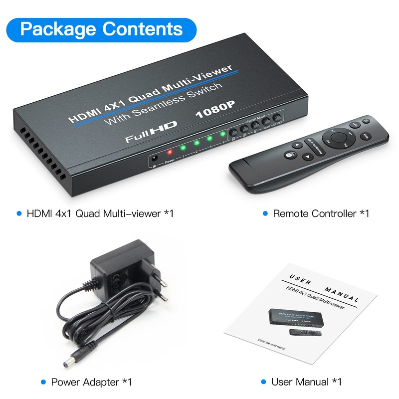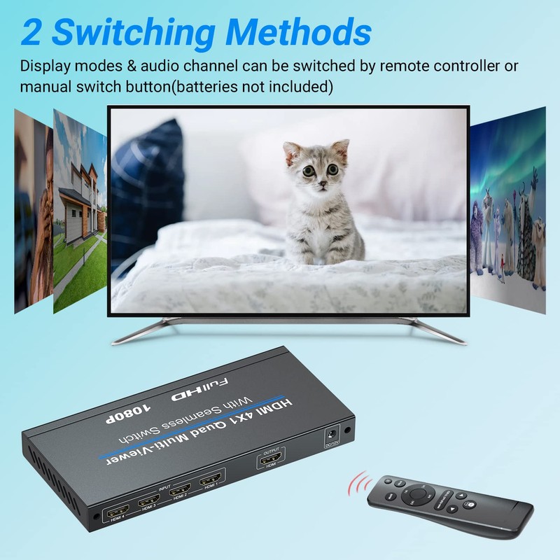 - 4x1 HDMI Quad Multi-Viewer: HDMI multiviewer with four inputs and one output allows users to view four HDMI sources on one HDMI screen in multiple display modes. Maximum input and output resolutions up to 1080P@60HZ. Note: the remote control does not contain batteries, please buy it yourself.