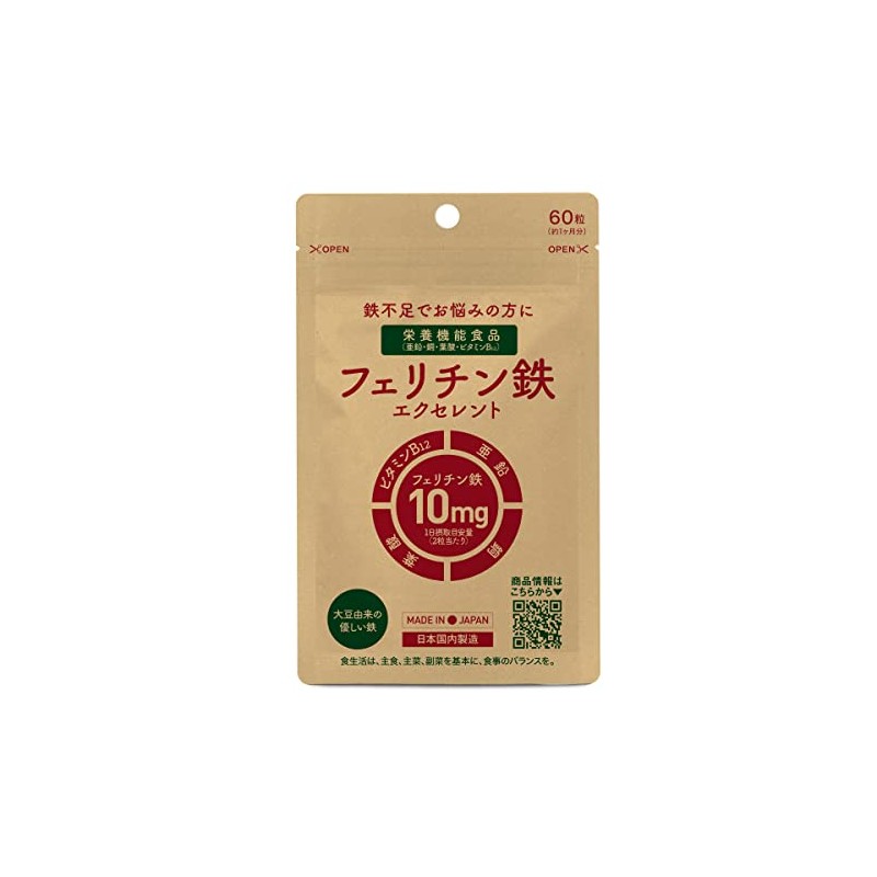 - 大豆由来の優しい鉄と言われているフェリチン鉄(まめ鉄)を鉄分として10mg(2粒当たり)、栄養機能食品として栄養成分(亜鉛:5.0mg、銅:0.6mg、葉酸:200μg、ビタミンB12:2.4μg(各2粒当たり))を配合したサプリメントです。