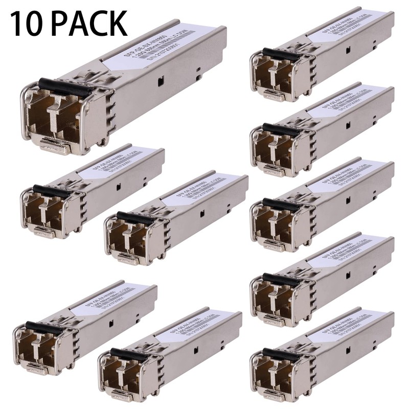 10 Pack 1.25G SFP SX optical module 850nm Multimode reach 550m transmission distance, SFP Fiber module is Hot-Swappable with ESD protection making upgrades and replacements seamless by minimizing network disruptions, It is designed for maximum equipment compatibility with SFF-8431, SFF-8432 and IEEE 802.3ab.