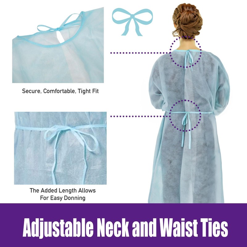- PERFECT UNIVERSAL FIT: The protective medical disposable gowns are designed with elastic cuffs to provide a snug fit under gloves and are full length for full coverage. The extra length on the waist ties allows the gown to be easily secured in front for added confidence.