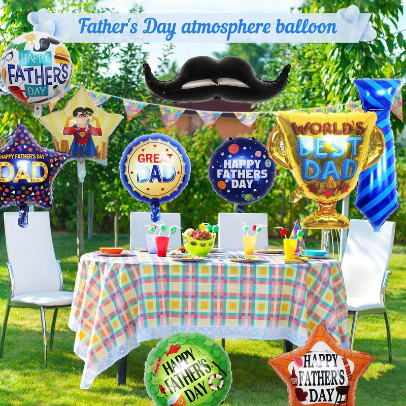 - Package Content: You will get 10pcs large size Father's day foil balloons, include 4pcs 18inch different round balloons, 3pcs 18inch different star shape balloons, 1pc 36inch moustache balloon, 1pc 39inch necktie balloon, 1pc 26inch trophy balloon, 2pcs ribbon, 1pc straw. Enough quantity and various colors will meet your Father's Day party decoration