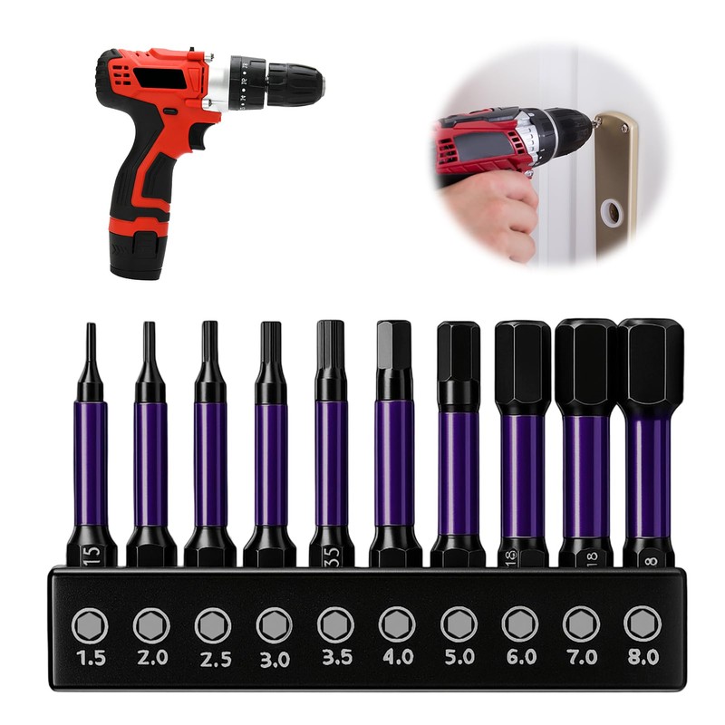 This 10-piece hex head drill bit set offers the precision, strength, and convenience needed for both home projects and professional use. Designed with magnetic tips, CNC-machined accuracy, and impact driver compatibility, these bits are perfect for working with hex socket screws in furniture, automotive, electronics, or machinery applications.Comprehensive Metric Size RangeThe set includes 10 metric sizes:1.5mm, 2mm, 2.5mm, 3mm, 3.5mm, 4mm, 5mm, 6mm, 7mm, and 8mm, covering a wide range of tasks from delicate assembly work to heavy-duty fastening. Each bit is 2 inches (50mm) long, offering extended reach for recessed or tight screw locations.Built for Impact Tools and High Torque WorkConstructed from S2 alloy steel, these bits are engineered to resist breakage and handle repeated impact driver use. The hardened core enhances strength, while the heat-treated surface improves durability under torque stress. Suitable for cordless drills, drivers, and ratcheting tools.Precision Machining for Secure FitEach bit is CNC machined to deliver accurate fitment in hex fasteners. This reduces the chance of cam-out and rounding, especially when used with high-speed tools. You can work more efficiently and with less damage to both tool and screw.Magnetised Tips for Better ControlThe hex bit ends are magnetised, allowing screws to stay attached during insertion and extraction. This is especially helpful in overhead or narrow areas where you need an extra hand. The magnetic strength is built into the core and does not fade with regular use
