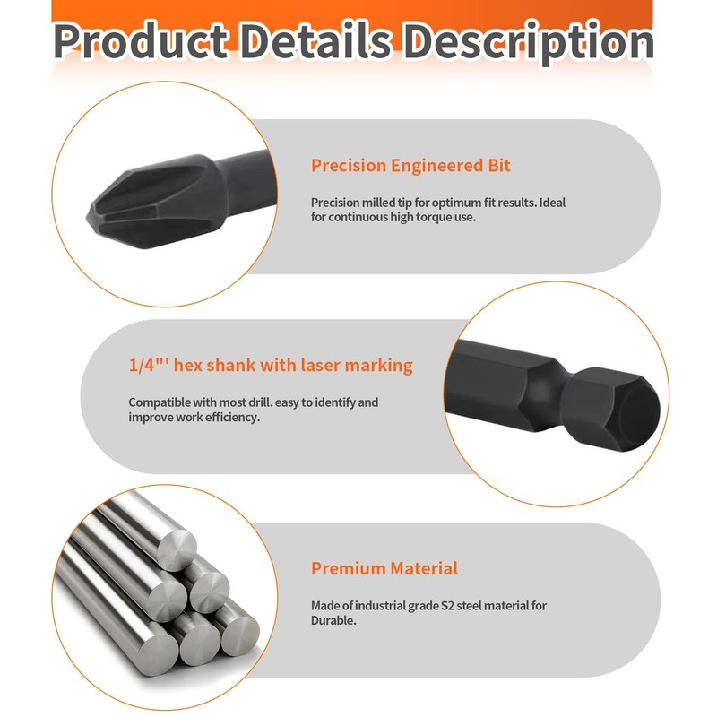- S2 steel for unmatched toughness: Screwdriver drill bits forged from heat-treated s2 alloy steel, these electric screwdriver bits outperform ordinary options with superior flex resistance and shock absorption. Magnetic drill screwdriver bits built to withstand heavy-duty impact drivers and high-torque drills, pz2 50mm impact driver bits go-to for demanding jobs without bending or snapping