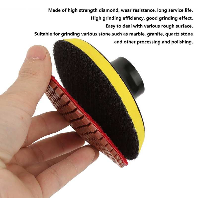 1、Made of high strength diamond, wear resistance, long service life. 2、High grinding efficiency, smooth, unbroken edges, will not produce tremor. 3、Good polishing effect, easy to deal with various rough surface. 4、Suitable for grinding various stone such as marble, granite, quartz stone and other processing and polishing. 5、With the use of grinding machine, efficient and fast.