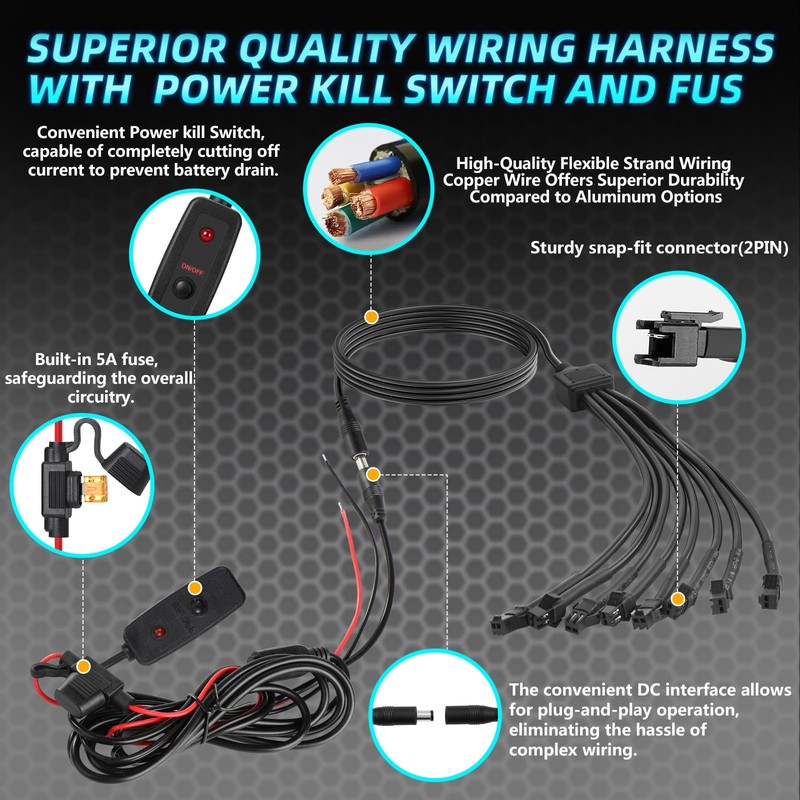 - Convenient Wiring Harness Connector and Power kill Switch: Our rock lights pure white come with specialized wiring harness connectors (splitters) designed for easy connection to each light. Unlike other products on the market that require direct positive/negative wire connections, our installation process is much simpler, eliminating the hassle of complex wiring. The included Power kill Switch allows you to turn the white led rock lights on or off at any time, preventing unnecessary battery drain. (Built-in 5A fuse)