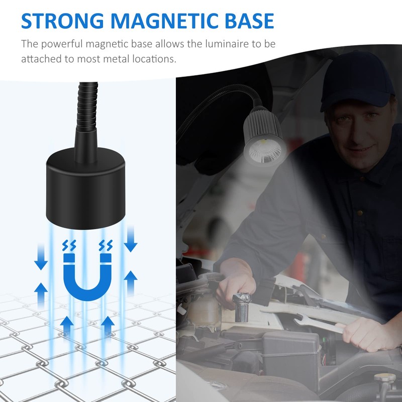 - 【Strong Magnetic Base】The magnetic work light has strong magnetic attraction, which makes this flexible gooseneck light can be attached to the metal surface stably. You can use the magnetic base lamp on all magnetic compatible bases, free up your hands and you can focus more on your work.