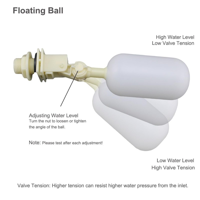 • The water inlet connector is 20mm or 3/4 inch thread. Please refer to one of the photos to understand the working machnism and adjust the floating ball to fit your need.