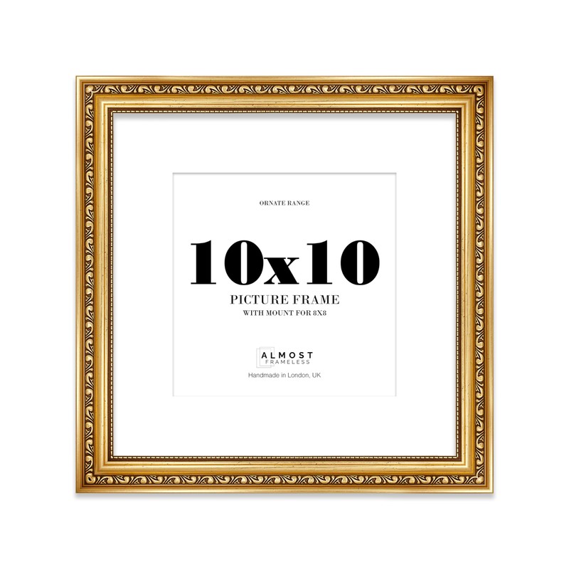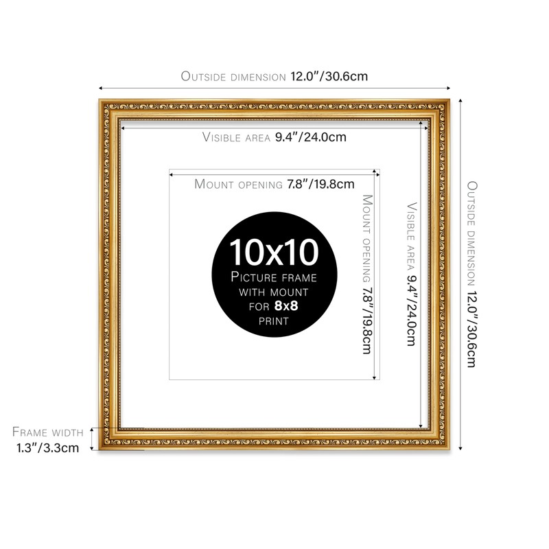 10x10 Gold Ornate Photo Frame With White Mat For 8x8 Picture, Ready to Hang or Stand, 1 Pack