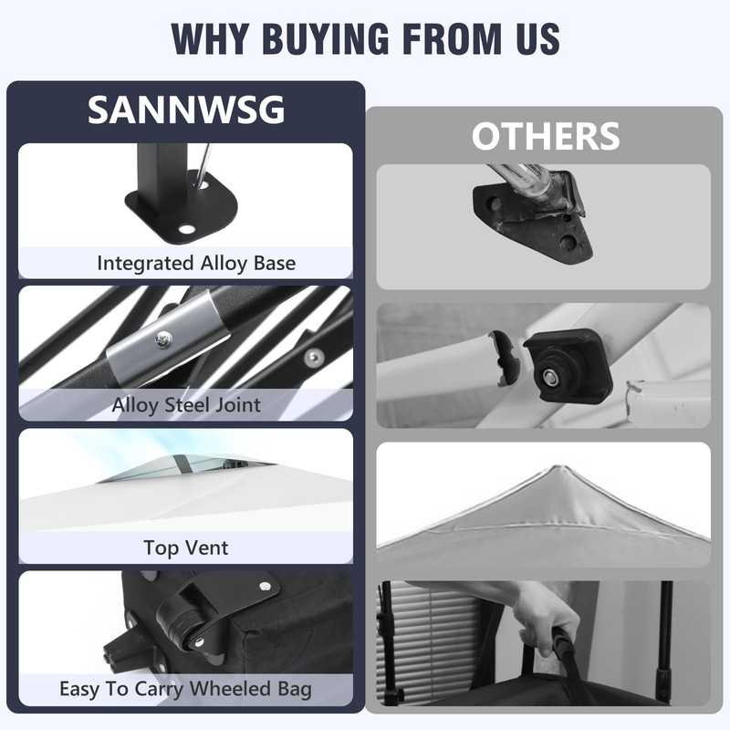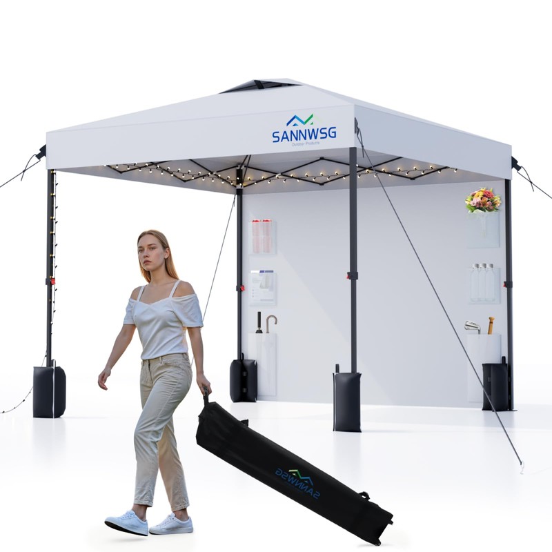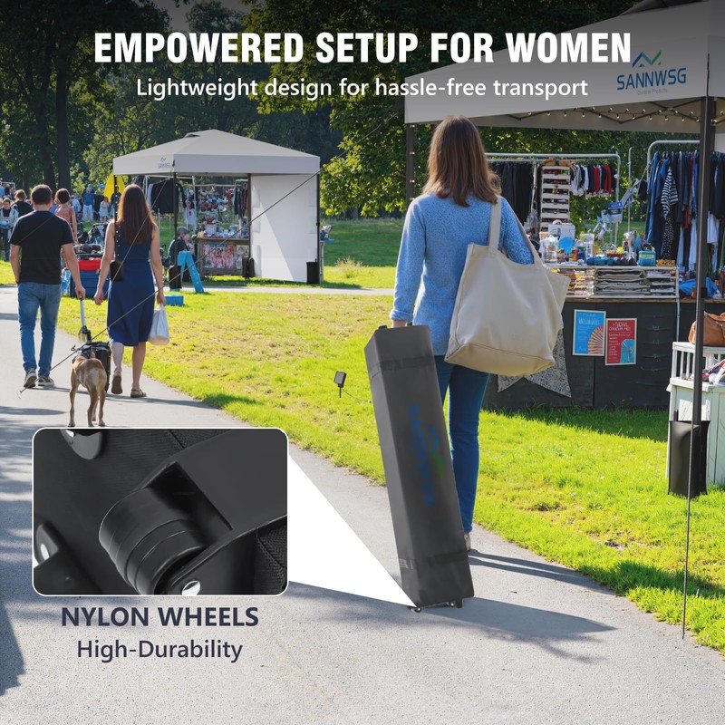 Easy transport & storage with an upgraded wheeled bag (top + side handles + full zipper). Package includes: Steel frame, canopy top, 4 ropes, 8 stakes, plus FREE solar LED lights & sandbags!
