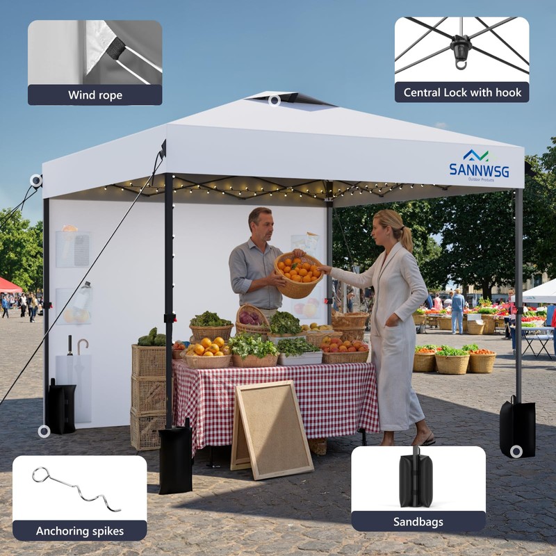 - 【 Enhanced Stability】 – To prevent the pop up canopy from being toppled by strong winds, we've incorporated two-way vents for improved airflow control. Additionally, the canopy tent is reinforced with 4 sandbags, wind ropes, and spiral ground nails, ensuring a secure and stable ground attachment even in harsh conditions.