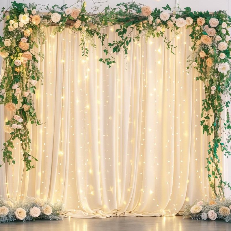 - 【Stunning Wedding Backdrop Curtains】Create a magical atmosphere with the fairy lights backdrop curtains 10ft x 10ft! The set includes 2 panels of 5ft (W) x 10ft (H) champagne backdrop curtains, a 9.8ft LED light string (USB Powered), and 12 transparent clips. Ideal for weddings, birthday parties, and photography, or to cover up unsightly walls.