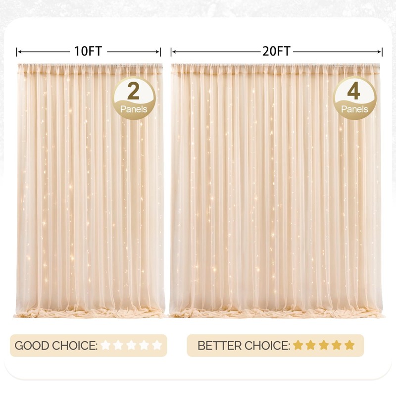 10x10ft Champagne Tulle Backdrop Curtain with Lights String for Parites, Sheer Photo Backdrop Curtains with Lights for Wedding Backdrop Ceremony Reception Bridal Shower Baby Shower Birthday Party