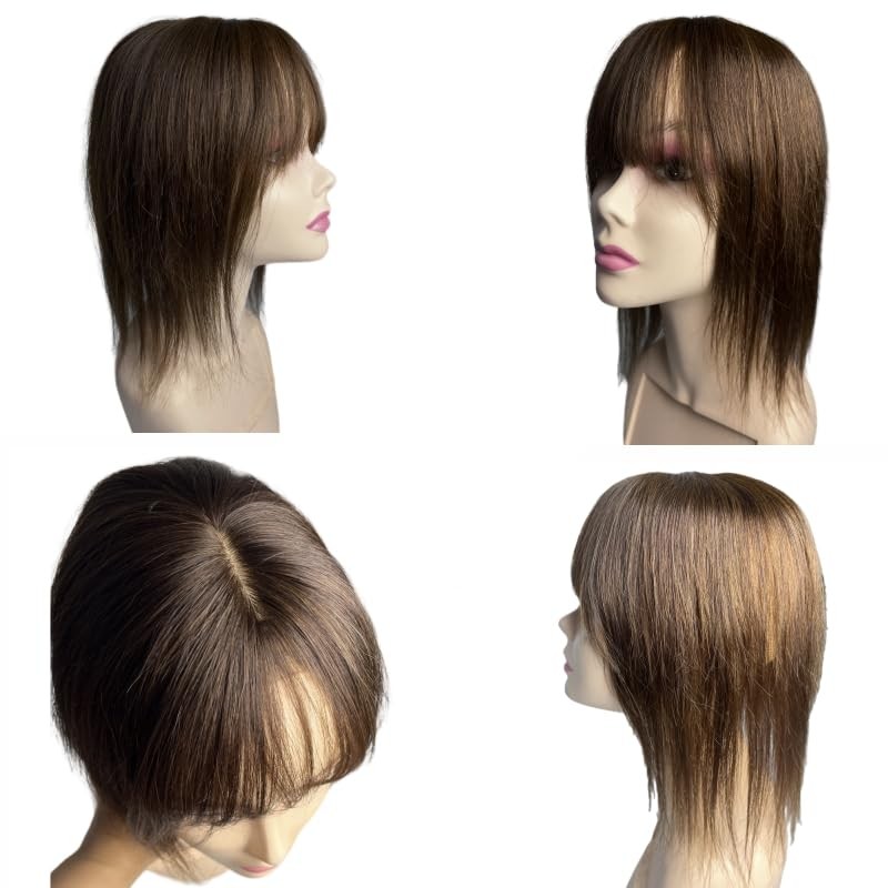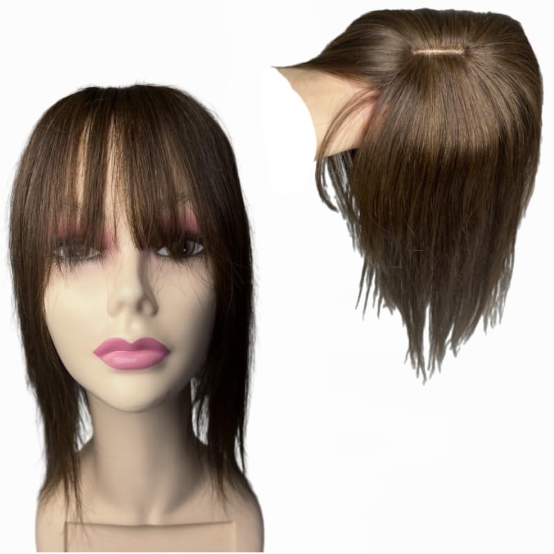 10x12 Lace Base Human Hair Toppers With Hair Bangs Fringe Hair Invisible Natural Hairpiece Clip In Hair Extension For Hair Volume 220% Density (30cm (12inch), Dark Brown)