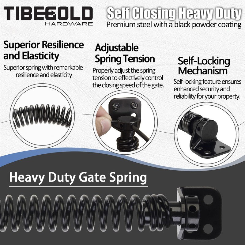 - Durable Gate Spring Self Closing: The TIBEGOLD 11-1/2" spring is expertly crafted from premium quality steel with a black powder coating for enhanced corrosion and rust resistance, designed for long-term outdoor use. Its exceptional hardness and elasticity allow for flexible adjustments based on the door's weight, making it an indispensable accessory for gate locks.