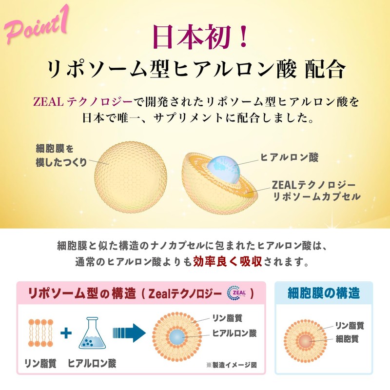 - 【1粒あたりの成分含有量】 ヒアルロン酸・・・・120mg(リポソーム型 50mg/超低分子〜高分子 70mg)