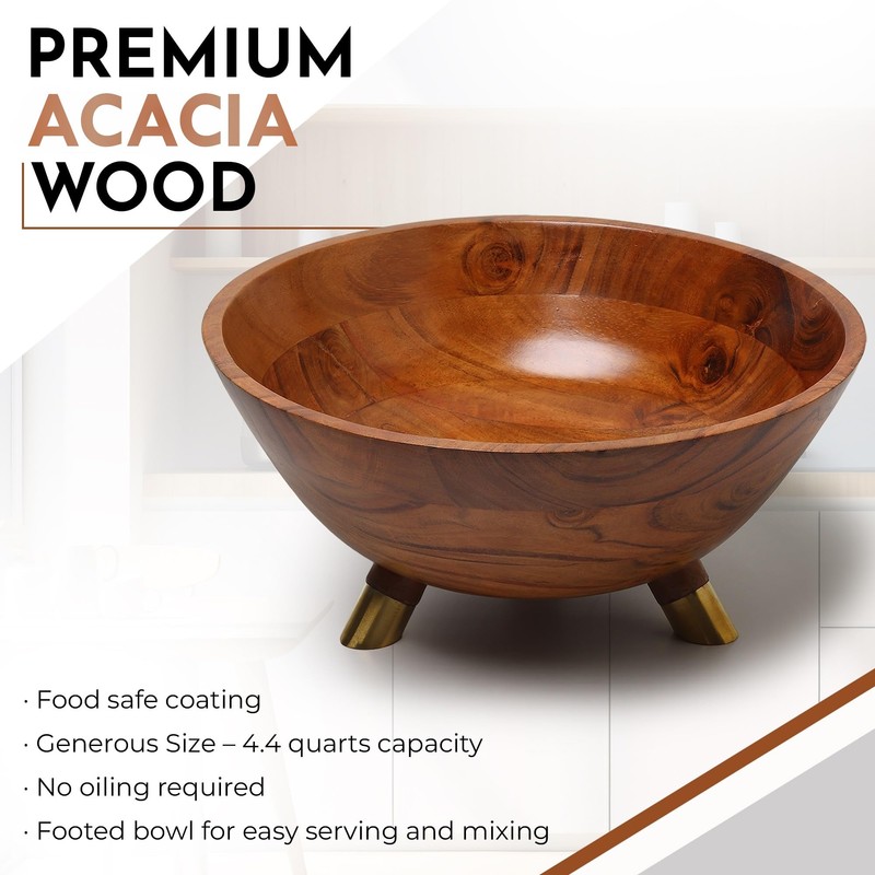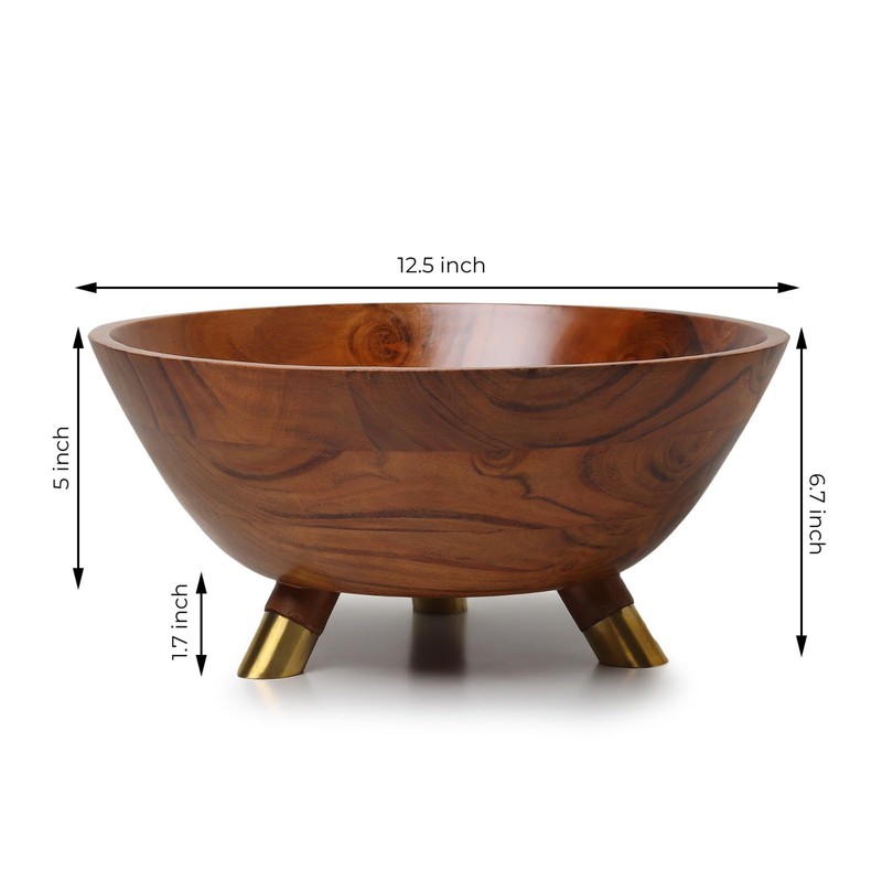 11.8 inch Acacia wood bowl with three Brass legs | 4.4 quarts capacity | Wooden Salad bowl for Salad, Fruit, Rice, Popcorn, pasta | Serving bowl for breakfast, lunch or dinner (Medium)