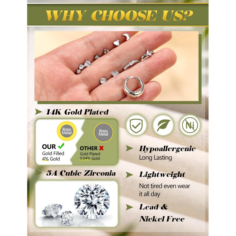 - Helix Piercing Jewellery: The 11 pairs hypoallergenic earring set includes 6 pairs of flatback ear studs, 1pairs of climber earrings, 2 pairs of cz hoop cartilage earrings, 1pairs of chunky hoop earrings and 1pairs of earring jackets. The small earrings are light in weight and comfortable to wear on a daily basis, can be wear alone or multiple, get different beauty from others by yourself