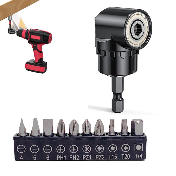 - Set Includes: 1 x 105° Angle Extension 1/4" 6mm Hex Bit Screwdriver Bit Adapter, 10 Different Screwdriver Bits Attaches to a drill, cordless drill or hand screwdriver to get into tight places they can't reach, and to rotate.