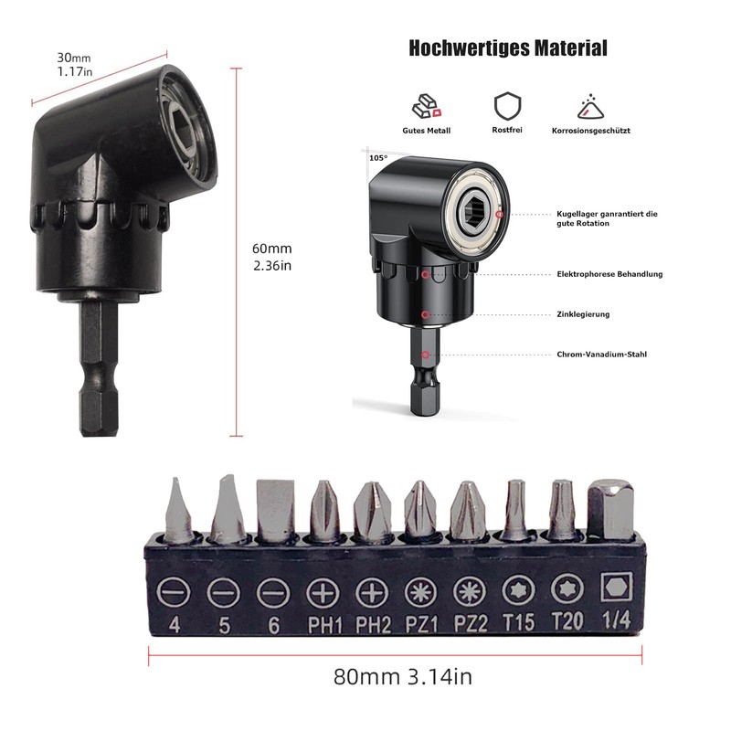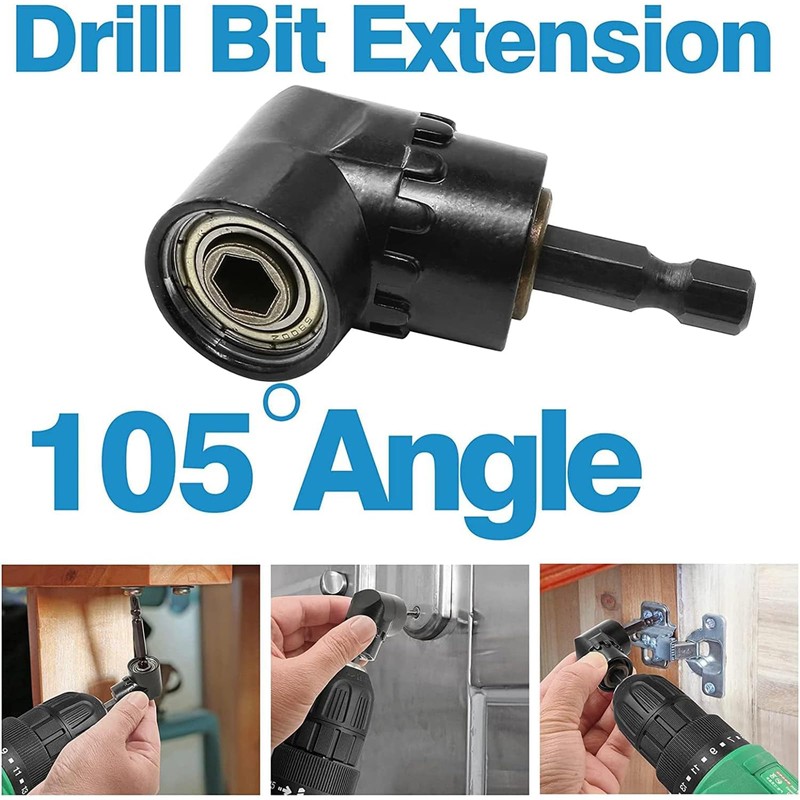 - HIGH QUALITY 105° Angle Drill Bit Made of chrome vanadium steel, angle drill holder with high hardness, rust proof, durable die cast housing with 3 ball bearings for long life, strong built-in magnetism, good holding power, this angle drill bit attachment is easy to use and prevent falling. The batch head attachment is made of durable alloy steel for durability.