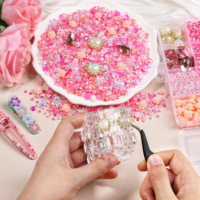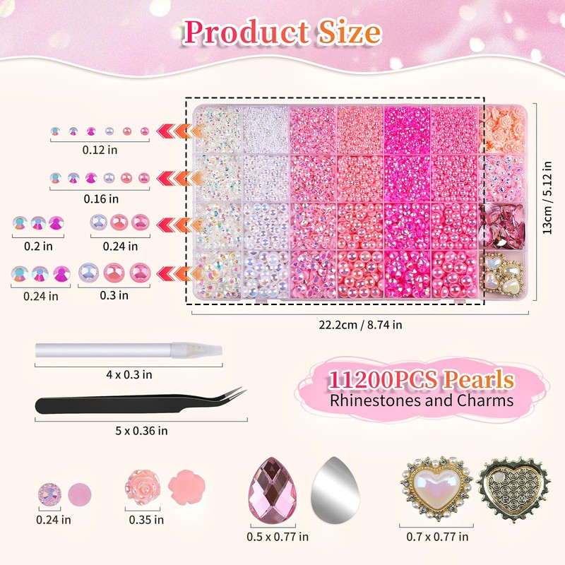 - 🌈 Gradient Gems and Rhinestones Kit: This pink rhinestones set includes 11,000+ half pearls (3/4/6/8mm) and resin AB rhinestones (3/4/5/6mm), paired with 140+ premium charms and gems, a black tweezer, and wax pickup pen, everything to ignite your creative spark.