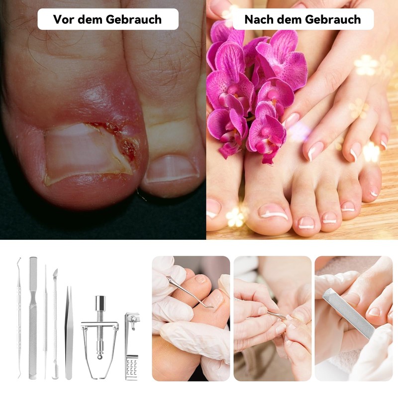 Das Nagelspange-System und Nagelspange Fußnägel-Lösungen unterstützen die präzise Ausrichtung. Unser Pediküre Set und Maniküre Set kombiniert mit dem Nagelpflegeset hilft, eingewachsene Zehennägel zu verhindern und Schmerzen zu lindern.