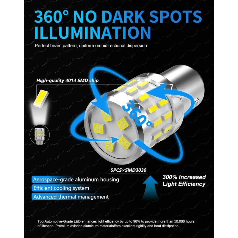 - 【360° Illumination】1157 LED Car Bulb adopts an innovative 360° lighting design, and a more concentrated beam. 360° shining without dark spots, which improves your visibility. 30PCS 4014 SMD chips surround the structure to ensure perfect omnidirectional lighting, provide a wider light coverage, enhance light penetration, and far exceed the performance of traditional LED lamps.